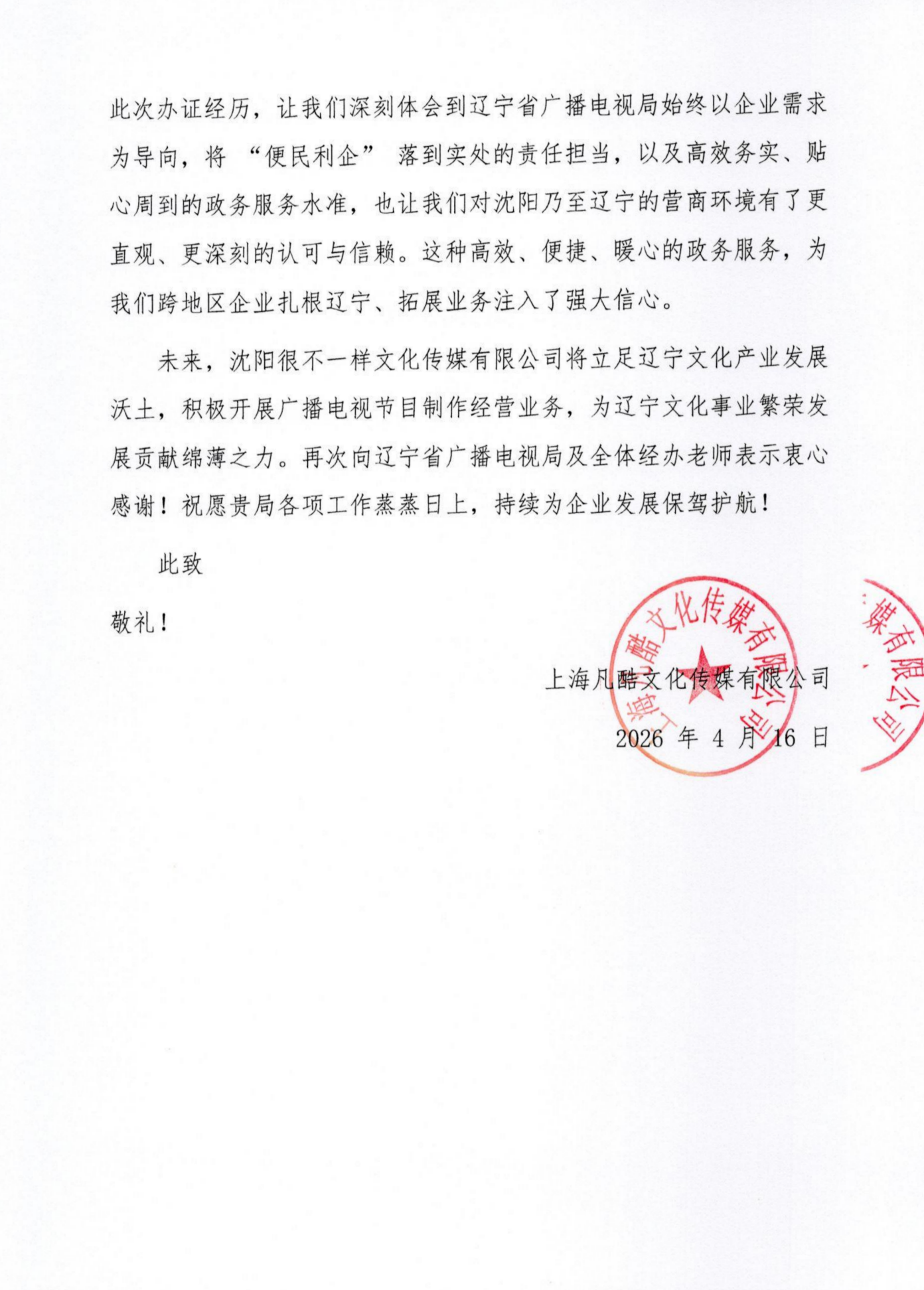 4月16日,上海凡酷文化传媒有限公司致信省广电局,对省广电局高效规范、务实担当、贴心周到的行政审批服务表示衷心感谢,对工作人员专业负责、主动靠前的工作作风给予高度评价,对辽宁营商环境表示高度认可。
